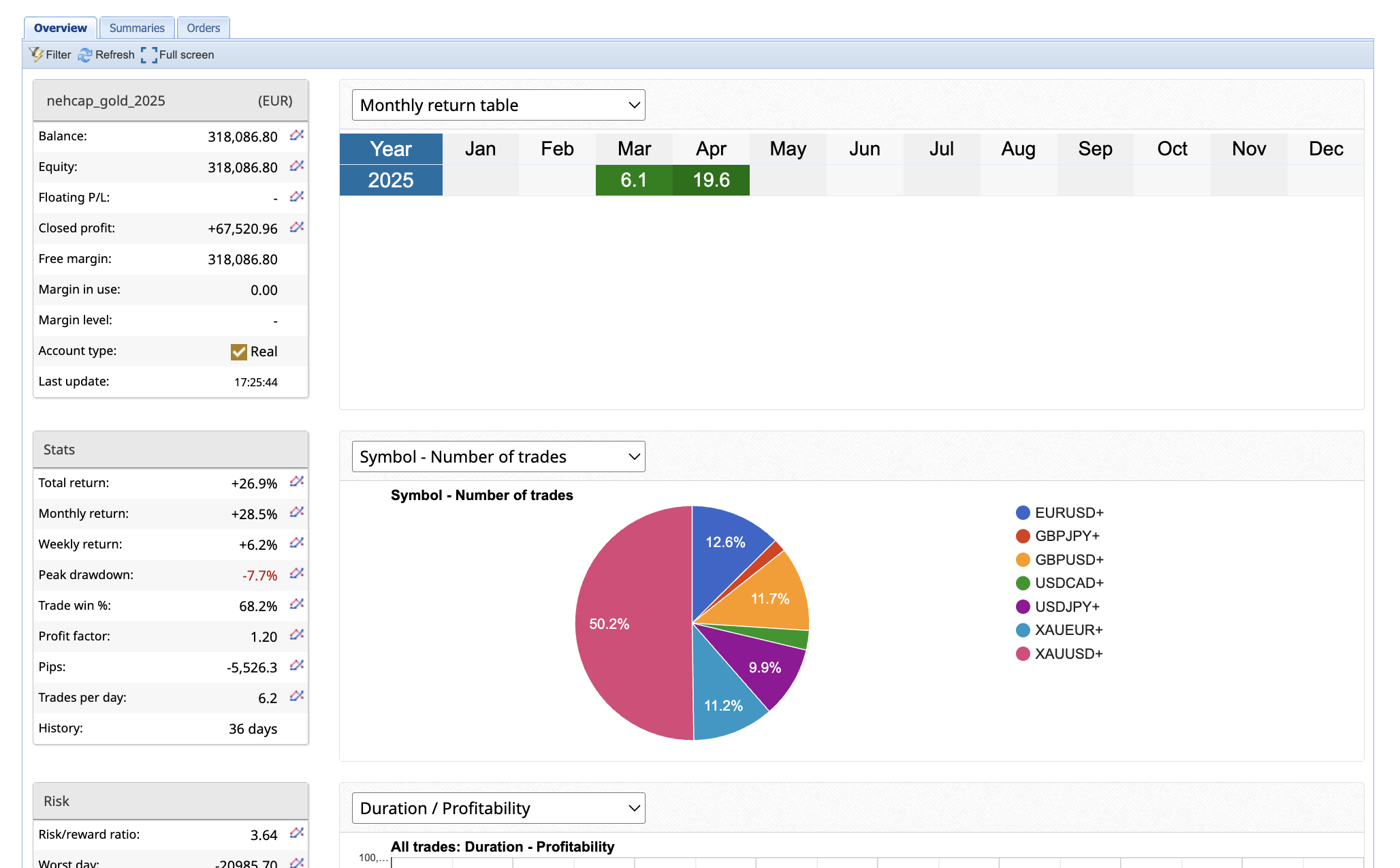 GOLDSCALPER (XAU/USD) ) returns in APRIL +19% alraedy added. February returns added +47%. Low dd, continuous trading marks the system. MARCH RETURNS +6%