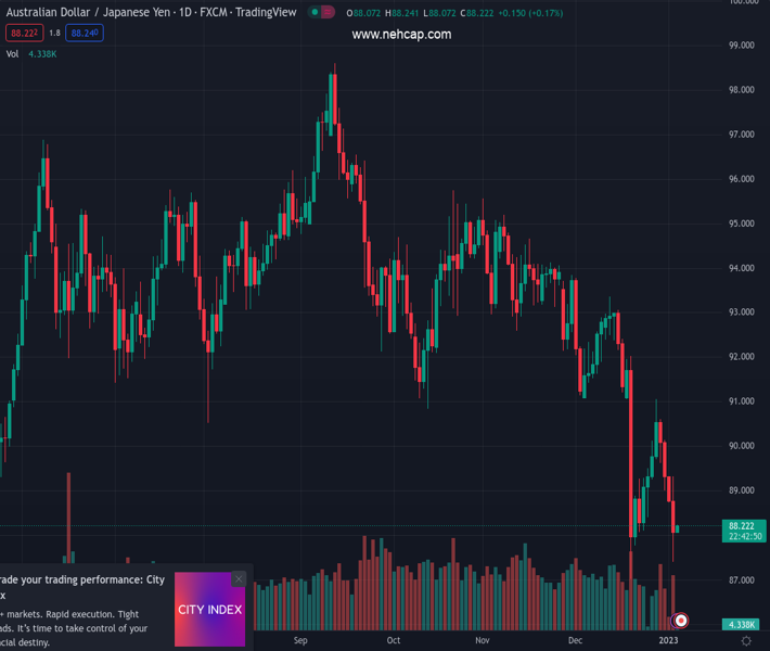 AUDJPY currently trading at 88.15 at the time of writing. Pair opened at 88.95 and is trading with a change of -0.9 % .