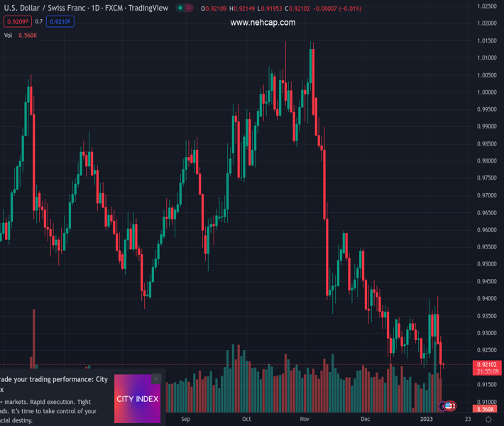 USDCHF currently trading at 0.9212 at the time of writing. Pair opened at 0.9277 and is trading with a change of -0.7 % .