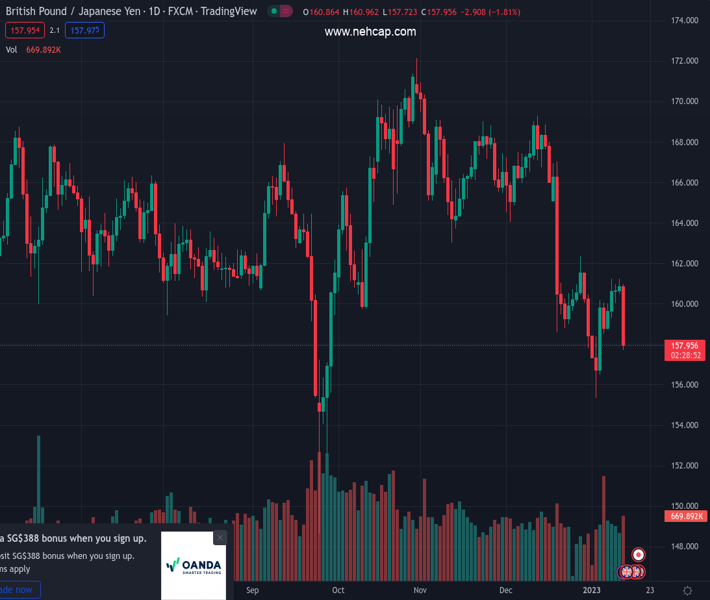 GBPJPY currently trading at 157.96 at the time of writing. Pair opened at 160.98 and is trading with a change of -1.88 % .