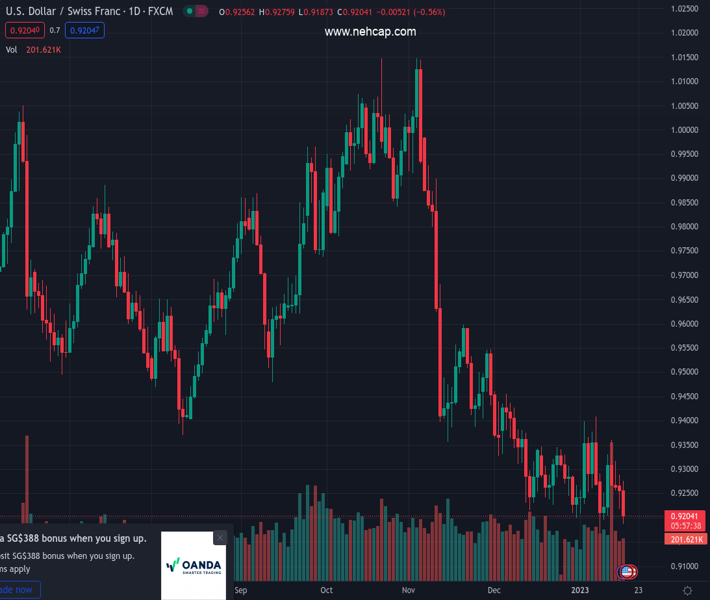 USDCHF currently trading at 0.9219 at the time of writing. Pair opened at 0.9263 and is trading with a change of -0.48 % .