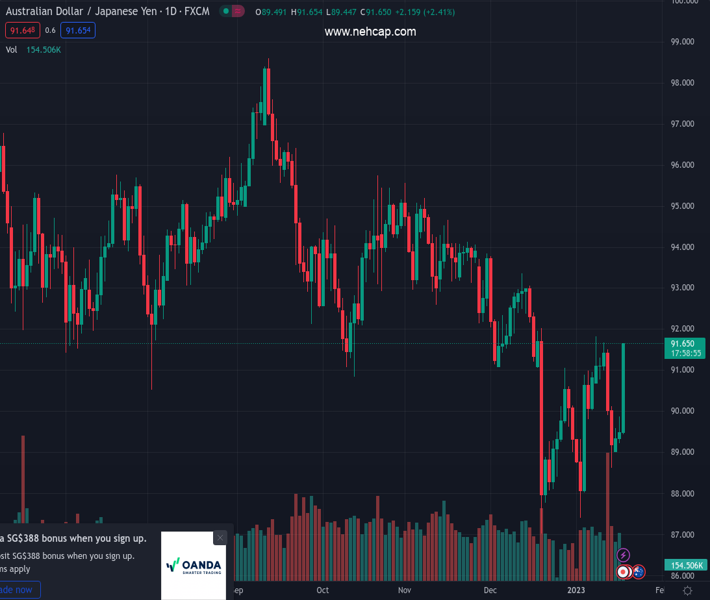 AUDJPY currently trading at 91.33 at the time of writing. Pair opened at 89.57 and is trading with a change of 1.96 % .