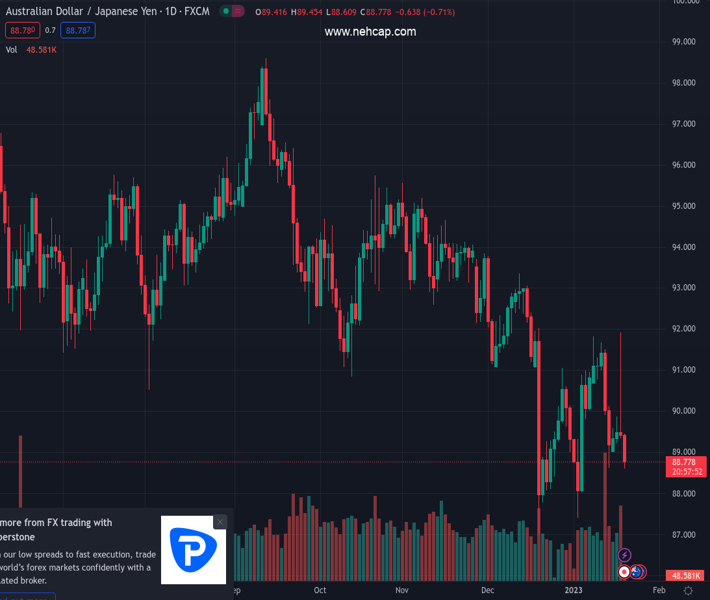 AUDJPY currently trading at 89.14 at the time of writing. Pair opened at 89.39 and is trading with a change of -0.28% % .