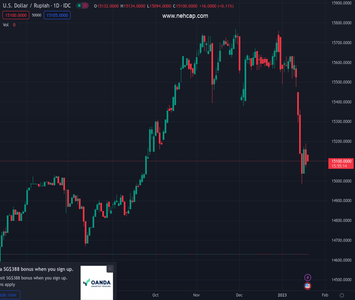 USDIDR currently trading at 15107.75 at the time of writing. Pair opened at 15158.6 and is trading with a change of -0.34% % .