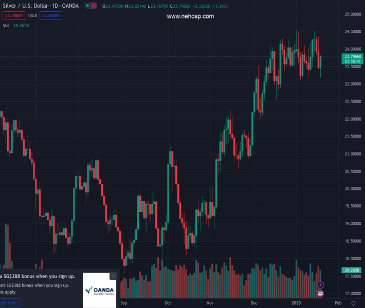 XAGUSD currently trading at 23.75 at the time of writing. Pair opened at 23.45 and is trading with a change of 1.28 % .