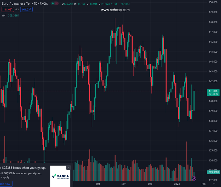 EURJPY currently trading at 141.14 at the time of writing. Pair opened at 139.08 and is trading with a change of 1.48 % .