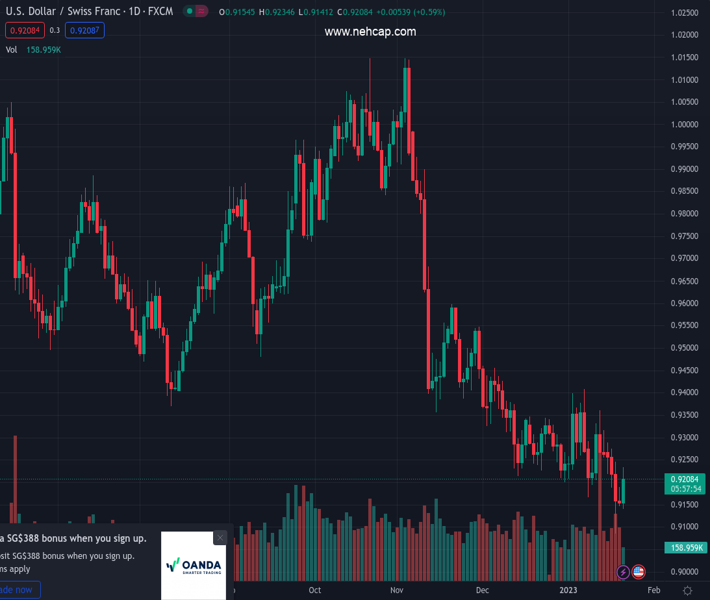 USDCHF currently trading at 0.9221 at the time of writing. Pair opened at 0.9157 and is trading with a change of 0.7 % .