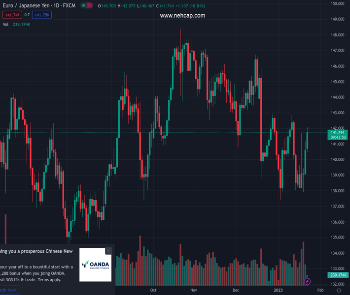 EURJPY currently trading at 141.69 at the time of writing. Pair opened at 140.68 and is trading with a change of 0.72 % .