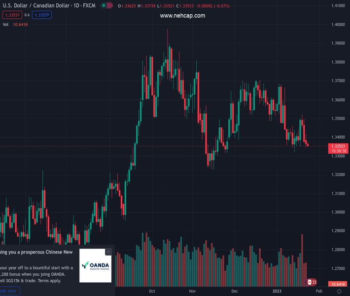 USDCAD currently trading at 1.3363 at the time of writing. Pair opened at 1.3374 and is trading with a change of -0.08 % .