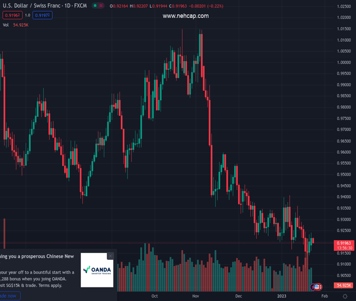 USDCHF currently trading at 0.9204 at the time of writing. Pair opened at 0.9223 and is trading with a change of -0.21 % .