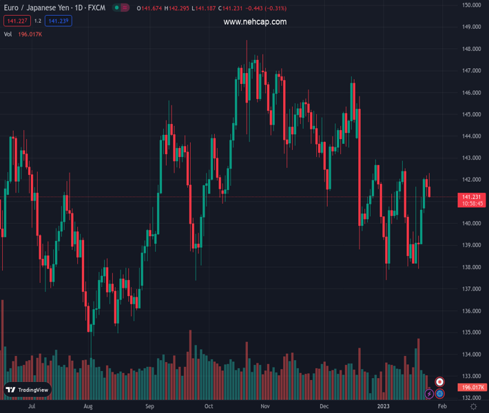EURJPY currently trading at 141.36 at the time of writing. Pair opened at 141.63 and is trading with a change of -0.19 % .