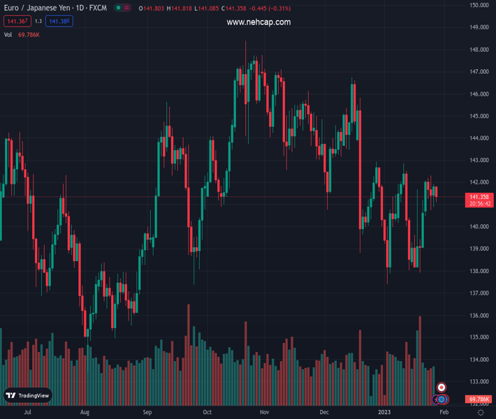 EURJPY currently trading at 141.52 at the time of writing. Pair opened at 141.87 and is trading with a change of -0.25 % .