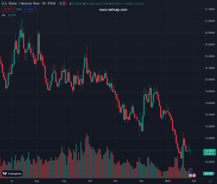 USDMXN currently trading at 18.7372 at the time of writing. Pair opened at 18.7944 and is trading with a change of -0.3 % .