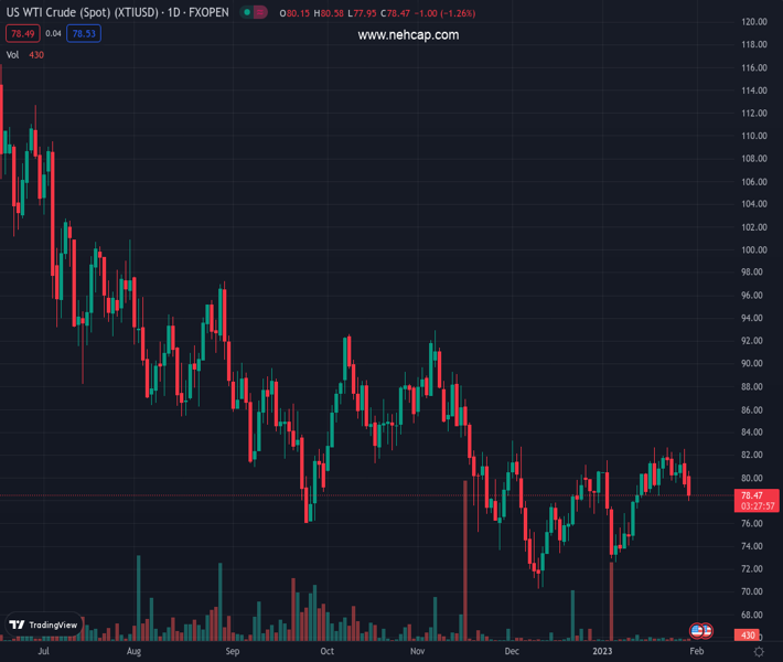 West Texas Intermediate has dropped by over 1% on the day and is trading around $78.50 at the time of writing after falling from a high of $80.44 and reaching a low of $77.91 so far on the day, ending a bullish start to the year towards month-end and following its fi4rst weekly loss last week for the year so far,