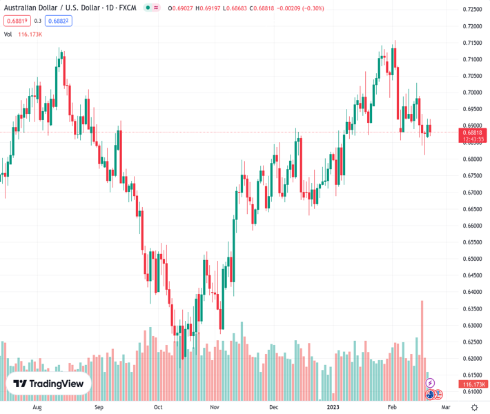 AUDUSD currently trading at 0.6875 at the time of writing. Pair opened at 0.6913 and is trading with a change of -0.55 % .