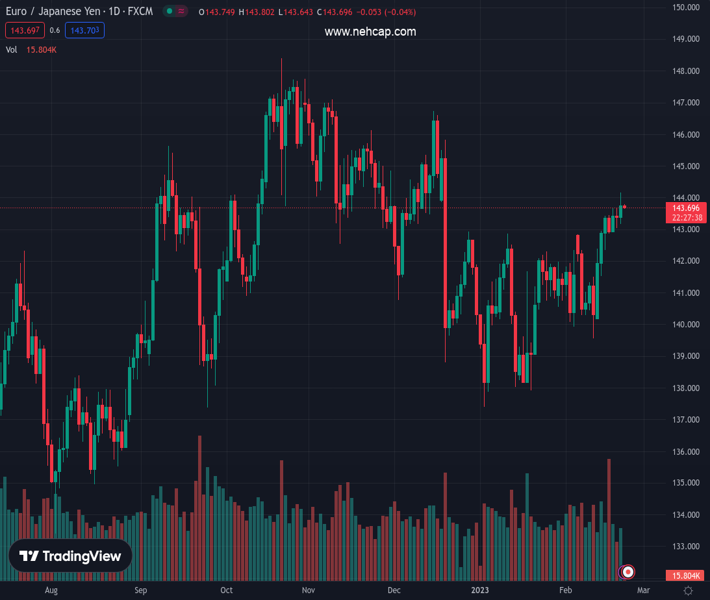 EURJPY currently trading at 143.74 at the time of writing. Pair opened at 143.45 and is trading with a change of 0.2 % .