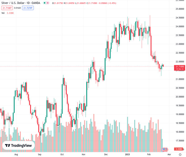 XAGUSD currently trading at 21.72 at the time of writing. Pair opened at 21.82 and is trading with a change of -0.46% % .