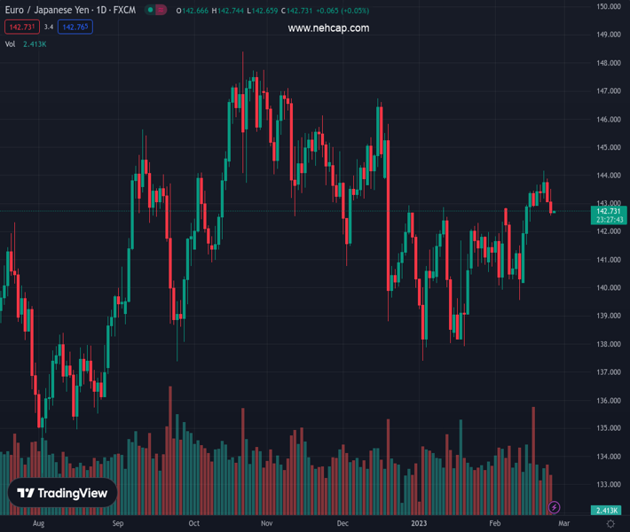 EURJPY currently trading at 142.71 at the time of writing. Pair opened at 143.11 and is trading with a change of -0.28 % .