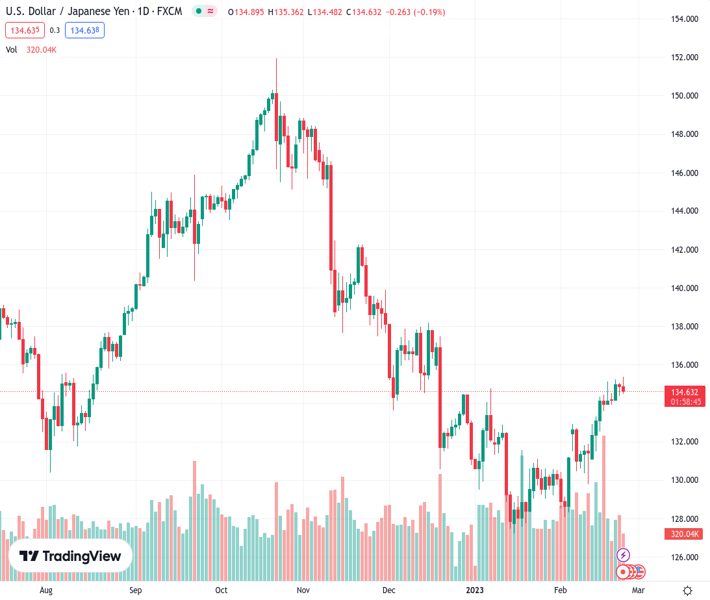 USD/JPY is trading offered in the afternoon on Wall Street and is down some 0.2% within the range of the day between 135.36 and 134.60. The US Dollar rose against its major trading partners on Thursday ahead of the release of an update to Q4 Gross Domestic Product growth (that missed expectations) and Weekly Initial Jobless Claims, (that beat expectations) as well as the Personal Consumption Expenditure (that also beat expectations) and was revised upward to 3.7%, indicating inflation was much stronger than initially thought and helping to stoke bearish sentiment among traders.