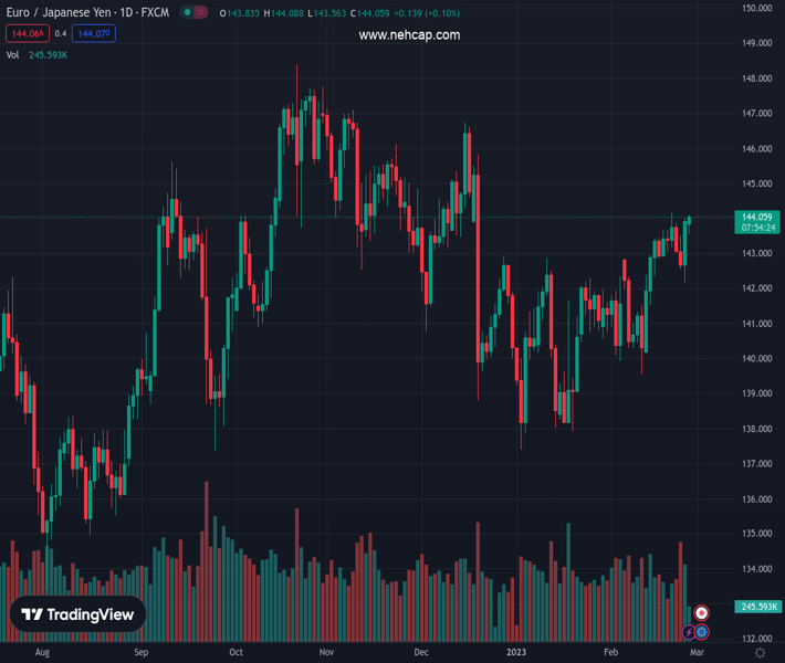EURJPY currently trading at 143.8 at the time of writing. Pair opened at 143.88 and is trading with a change of -0.06 % .