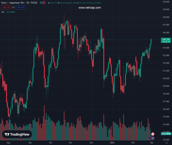 EURJPY currently trading at 145.11 at the time of writing. Pair opened at 144.54 and is trading with a change of 0.39 % .
