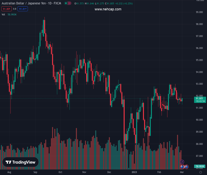 AUDJPY currently trading at 91.78 at the time of writing. Pair opened at 91.56 and is trading with a change of 0.24% % .