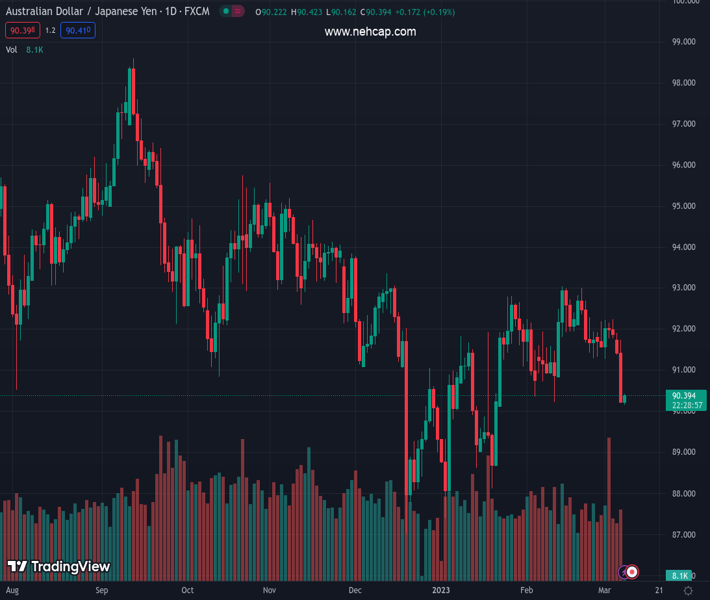 AUDJPY currently trading at 90.42 at the time of writing. Pair opened at 91.48 and is trading with a change of -1.16 % .