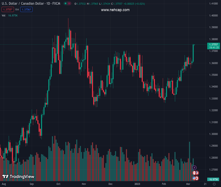 As a consequence, the yield on the US 10-year Treasury note rose to 4% before easing back to 3.96%, remaining marginally below the three-month high of 4.07% touched on March 2nd as investors assessed the pace of future rate hikes by the Federal Reserve. This gave the greenback a boost and USD/CAD remains better bid as the following illustrates: