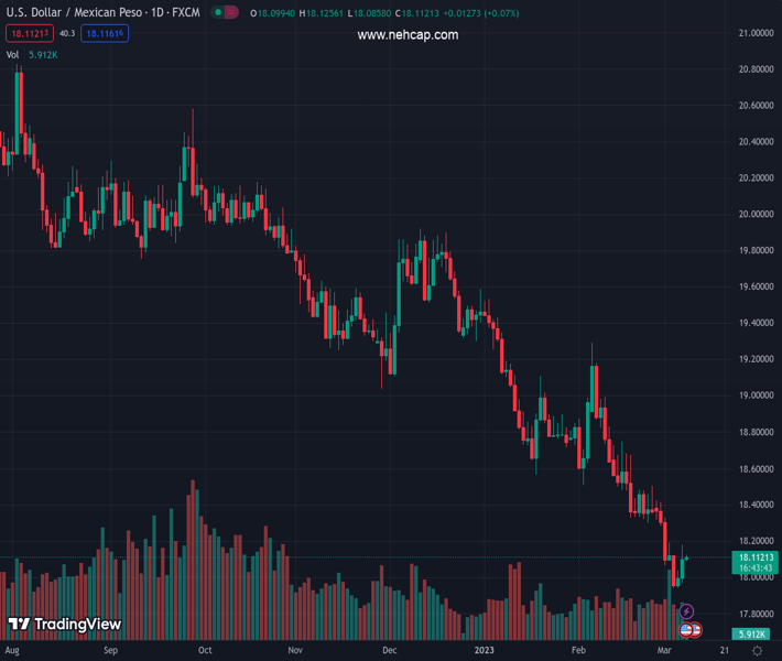 USDMXN currently trading at 18.1163 at the time of writing. Pair opened at 18.116 and is trading with a change of 0.00% % .
