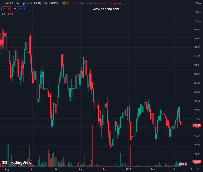 XTIUSD currently trading at 76.57 at the time of writing. Pair opened at 77.49 and is trading with a change of -1.19 % .