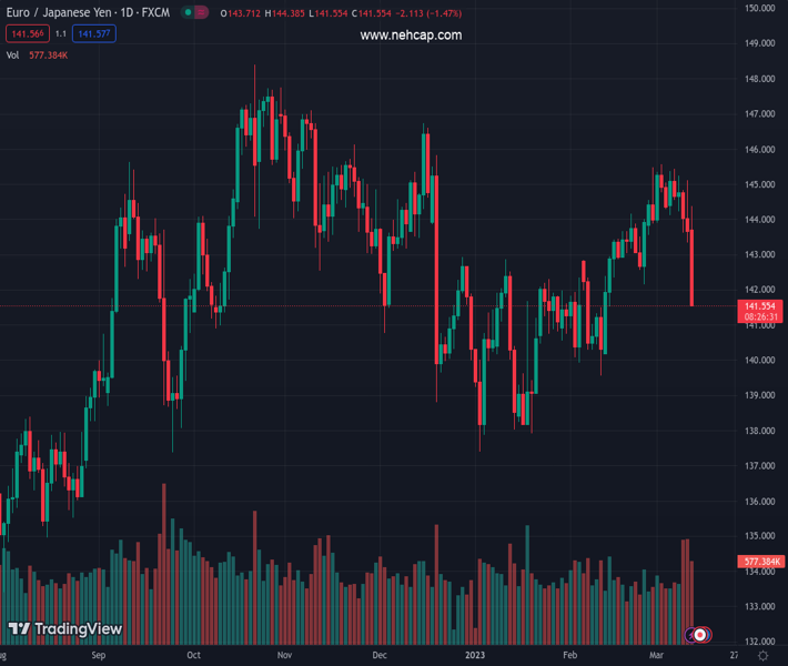 EURJPY currently trading at 141.92 at the time of writing. Pair opened at 143.45 and is trading with a change of -1.07 % .