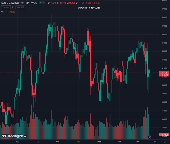 EURJPY currently trading at 141.68 at the time of writing. Pair opened at 141.81 and is trading with a change of -0.09 % .