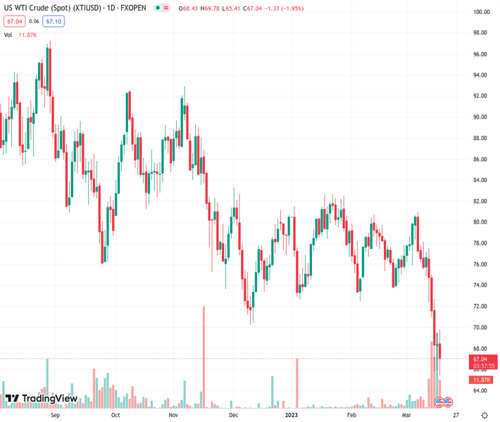 The barrel of West Texas Intermediate fell to $65.22 on Friday, its lowest since November 2022. It currently trades at around $67.30 a barrel, breaking lower amid financial turmoil weighing on the market mood.