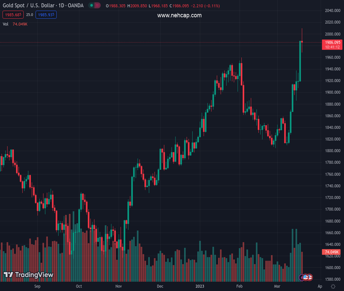 #XAUUSD @ 1,986.44 Gold price bulls come alive as safe-haven demand rockets on global banking fears.