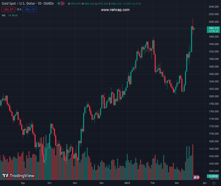 - Gold price surge amid falling US Treasury yields and global banking turmoil.