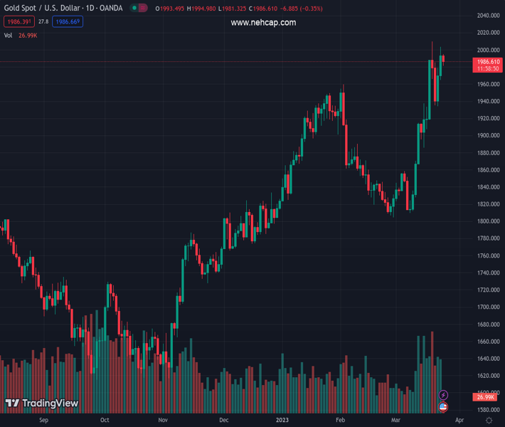 XAU/USD trades at $1,988 at the time of writing. It is in an uptrend on a medium and short-term basis, so bullish bets are favored. On Thursday it breached above the key $2,000 psychological mark for the first time since Monday when markets went bananas over the demise of Credit Suisse. Overnight it has undergone a gentle pullback and may now be said to be in what traders call the ‘buy zone’.