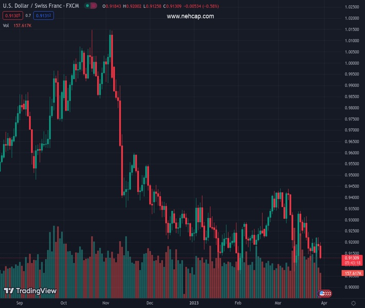 USDCHF currently trading at 0.9131 at the time of writing. Pair opened at 0.9185 and is trading with a change of -0.59 % .