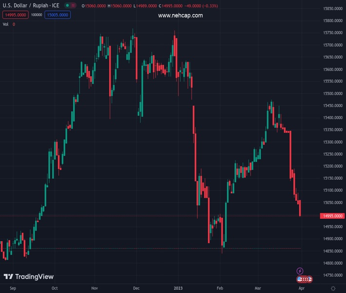 USDIDR currently trading at 14993 at the time of writing. Pair opened at 14968.65 and is trading with a change of 0.16% % .