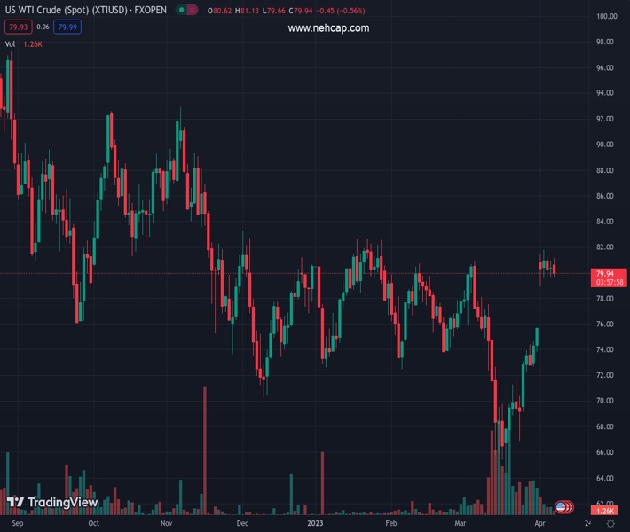 Early April, the Organization of the Oil Exporting Countries and Allies (OPEC+) surprised market players by announcing a cut in their oil output of around 1.16 million barrels per day, pushing West Texas Intermediate (WTI) roughly 5.5% higher on April 3, leaving a $4 unfilled gap. WTI has been consolidating between $79 and $81.80 since the announcement, unable to find fresh directional impetus.