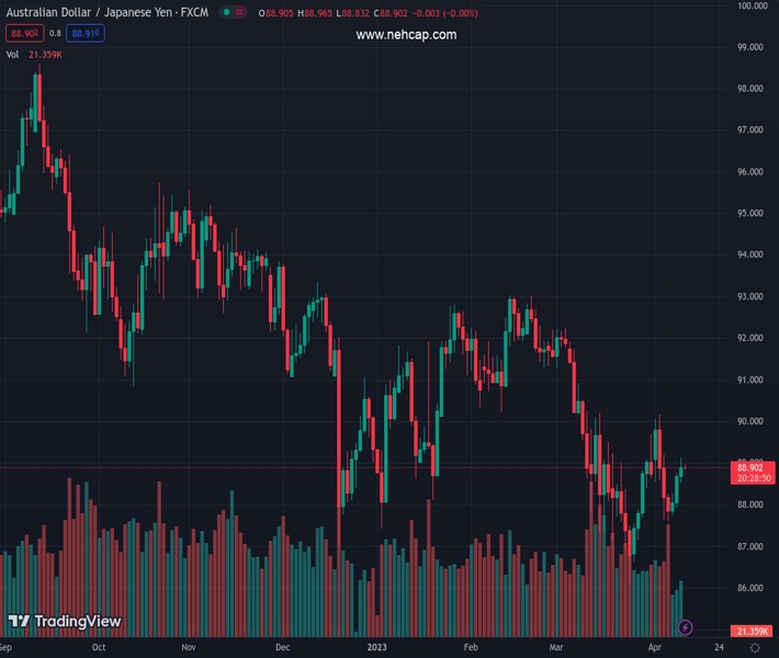 AUDJPY currently trading at 88.94 at the time of writing. Pair opened at 88.94 and is trading with a change of 0.0 % .