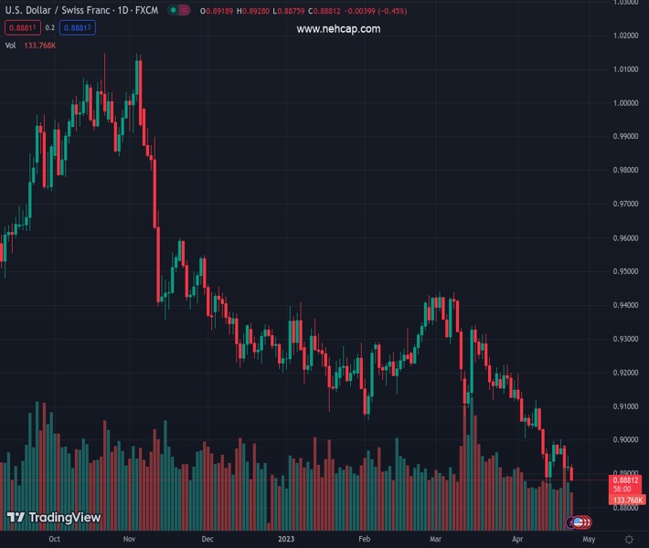 USDCHF currently trading at 0.8882 at the time of writing. Pair opened at 0.8922 and is trading with a change of -0.45 % .
