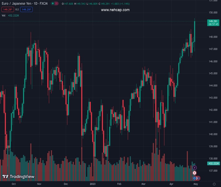 EURJPY currently trading at 149.38 at the time of writing. Pair opened at 147.73 and is trading with a change of 1.12 % .