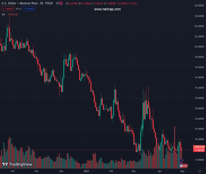 USDMXN currently trading at 17.9939 at the time of writing. Pair opened at 18.0389 and is trading with a change of -0.25 % .