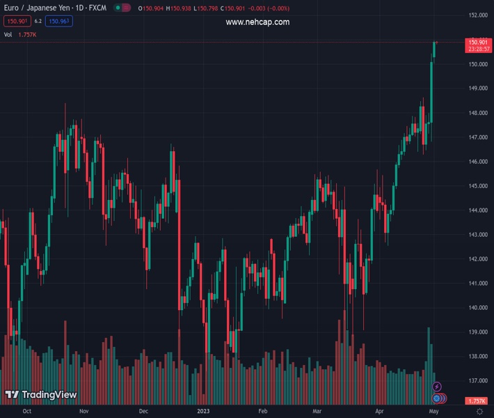 EURJPY currently trading at 150.89 at the time of writing. Pair opened at 150.08 and is trading with a change of 0.54 % .