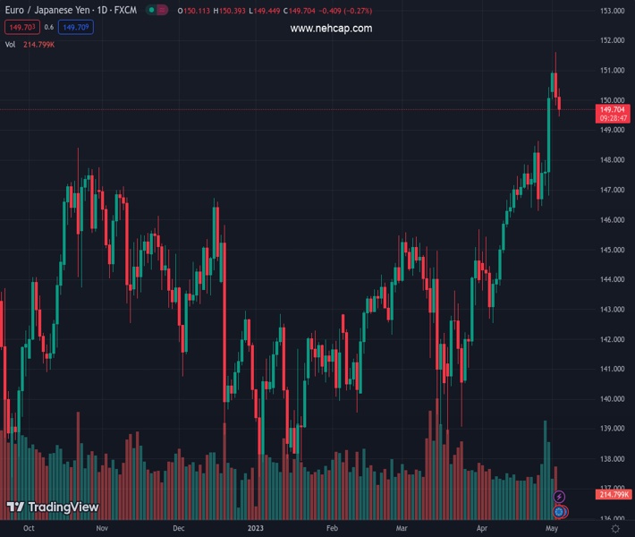 EURJPY currently trading at 149.67 at the time of writing. Pair opened at 150.23 and is trading with a change of -0.37 % .