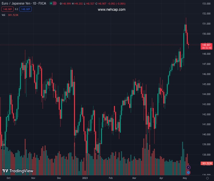 EURJPY currently trading at 148.86 at the time of writing. Pair opened at 149.0 and is trading with a change of -0.09 % .