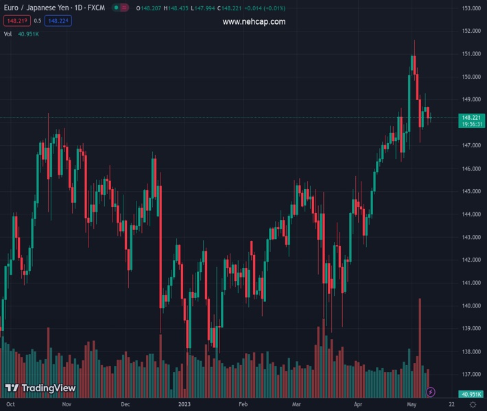 EURJPY currently trading at 148.36 at the time of writing. Pair opened at 148.24 and is trading with a change of 0.08% % .