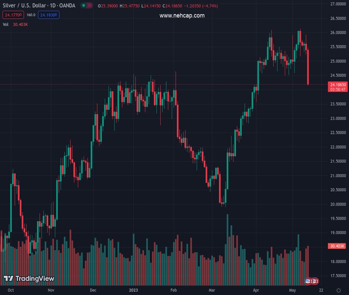 XAGUSD currently trading at 24.18 at the time of writing. Pair opened at 25.39 and is trading with a change of -4.77 % .