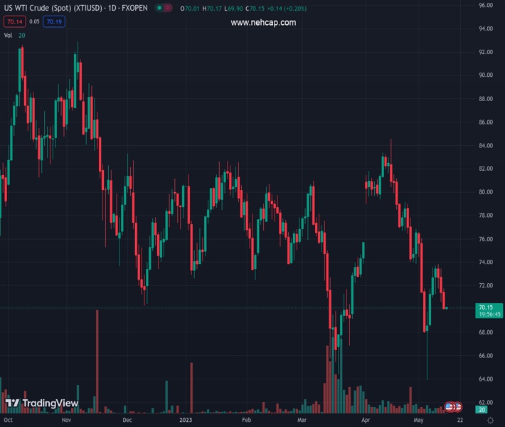 West Texas Intermediate (WTI), futures on NYMEX, are showing quite a sideways performance around $70.00 in the Asian session. The oil price is continuously facing selling pressure as a delay in negotiations over the United States borrowing cap limit has deepened fears of a recession in the economy.