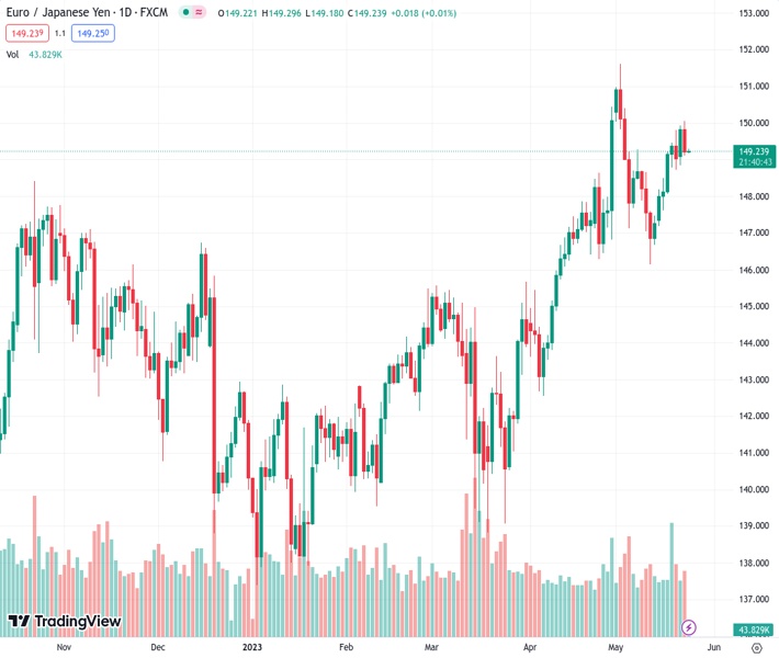 EURJPY currently trading at 149.24 at the time of writing. Pair opened at 149.87 and is trading with a change of -0.42 % .